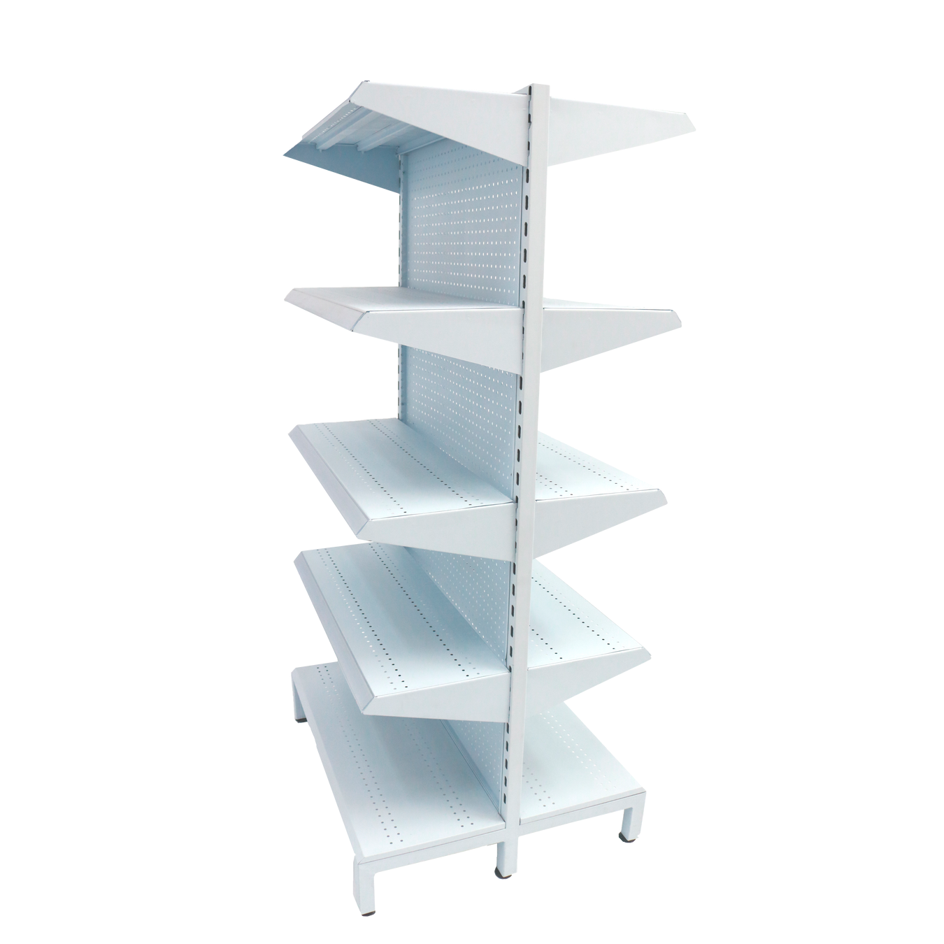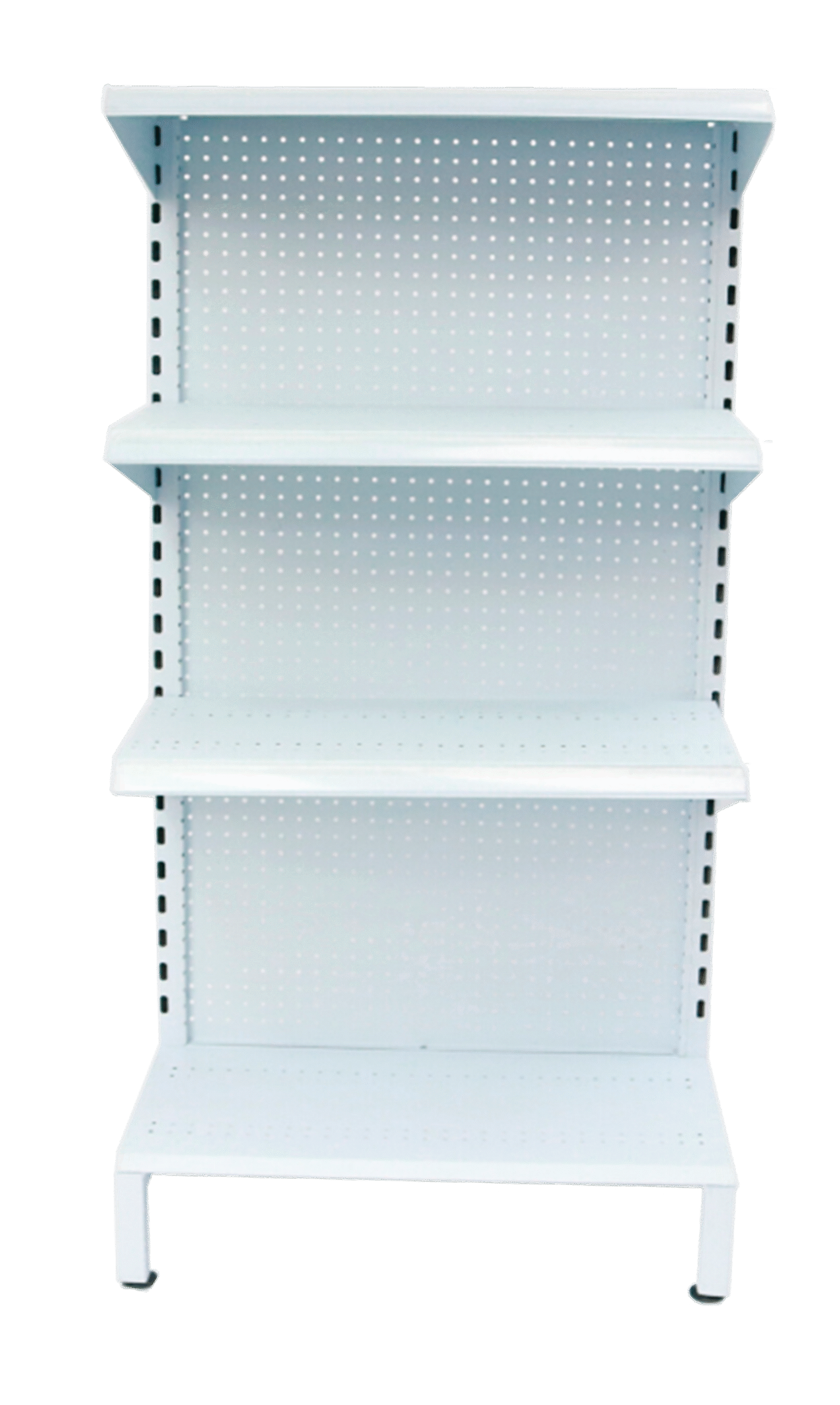 Unidad diseñada para mantener la visibilidad a través del local. La estructura de Tubo Calibre 16 y la Pintura Electroestática en color Blanco garantizan durabilidad. Incluye un total de 8 niveles (Base + 3 Entrepaños por lado) para una exhibición completa.
